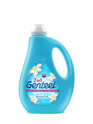 The packaging for Genteel fabric detergent and softener features delicate flowers and a soothing light blue colour, symbolising softness and freshness. Its design evokes purity, offering a gentle yet effective laundry experience.
